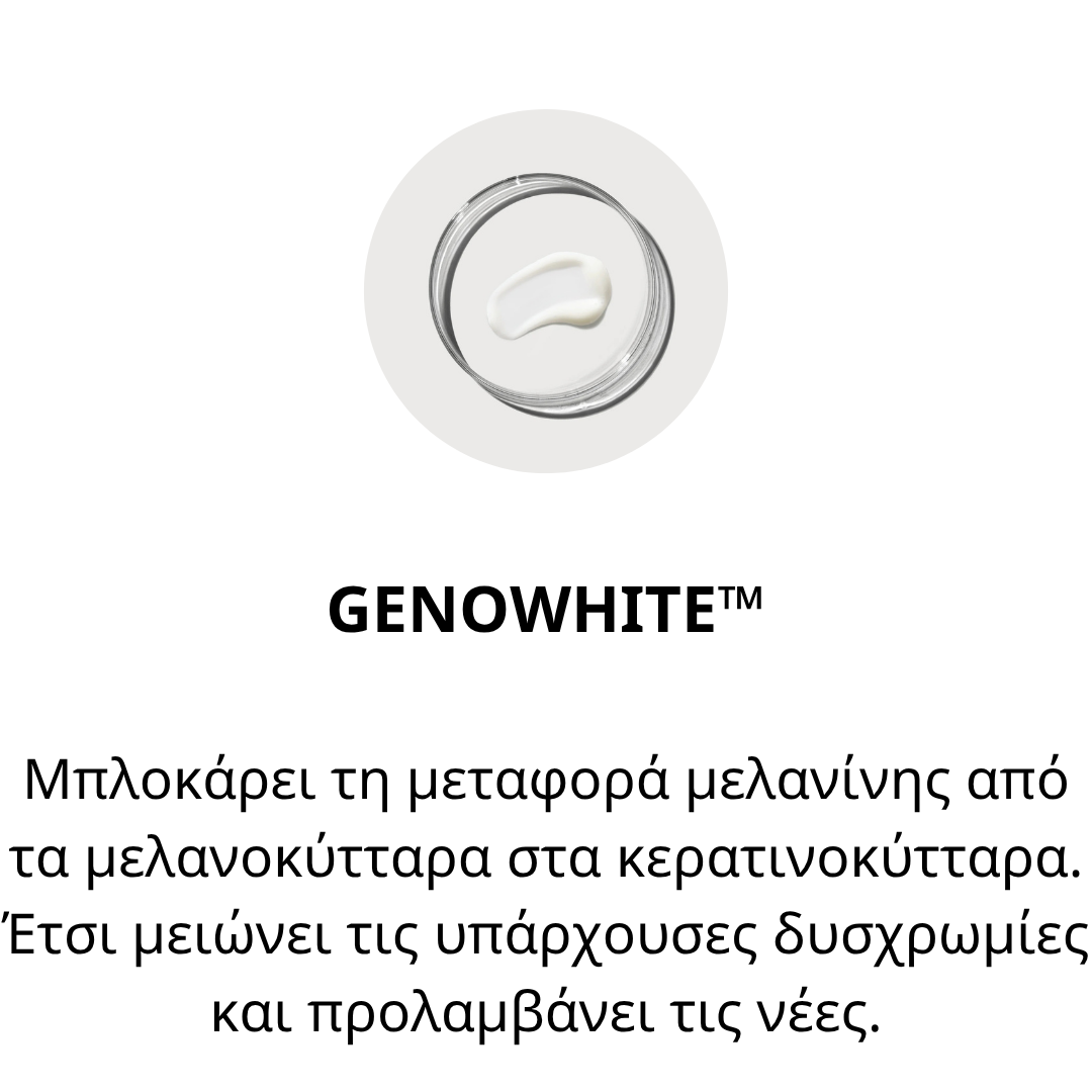 Το πατενταρισμένο πεπτίδιο GENOWHITE™ που χρησιμοποιήθηκε για πρώτη φορά εξασφαλίζει άμεση δράση και ορατά αποτελέσματα από την 1 εβδομάδα!